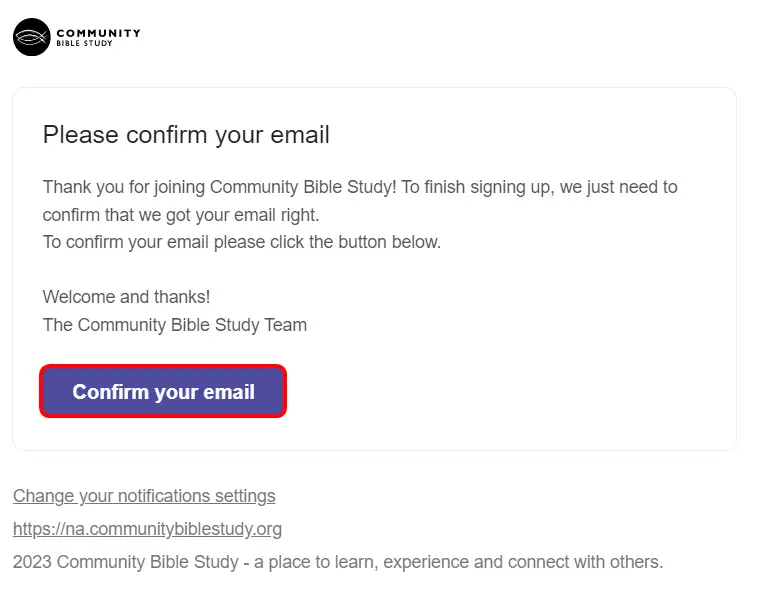 3.) You will receive an email from na@notifications.communitybiblestudy.org. Click Confirm your email. Note: If you don’t see this email in your inbox, check your spam folder.